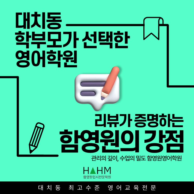 안녕하세요, 대치동 함영원영어학원입니다 :) 최근 네이버 방문자 리뷰가 빠르게 쌓이면서 부모님들이 직접 남겨주신 평가가 큰 힘이 되고 있습니다❤️ 오늘은 저희 학원을 직접 경험한 학부모님들의 네이버 리뷰를 토대로, 많은 분들이 공통적으로 말씀해주신 핵심 강점을 정리해보았습니다. 수업이나 시스템을 설명하는 것보다, 부모님이 남긴 솔직한 한 줄이 더 큰 힘을 가진다는 걸 잘 알기에 하나하나 감사한 마음으로 공유드립니다. 아래에는 ‘믿고 맡길 수 있는 학원인지’ 를 판단할 수 있는 중요한 내용이 담겨 있습니다. 1. 압도적으로 많이 언급된 키워드 ‘맞춤 지도’ & ‘열정적인 선생님’ ✔ “맞춤 지도를 잘해줘요....... <img src="https://blogthumb.pstatic.net/MjAyNTEyMTFfMjEx/MDAxNzY1NDU5MjczMjg1.sH-hUo6maE2NyWfqbvGimLczmh_IJK79QVrIt4fYpOIg.S0L8OSxNDC71mDwPpE8acFwrmTwM4ZwgV7n9CcyESWAg.PNG/%BF%B5%BE%EE%C7%D0%BF%F8%28%C4%AB%B4%BA%291210%BA%CE%C5%CD_%285%29.png?type=s3" />