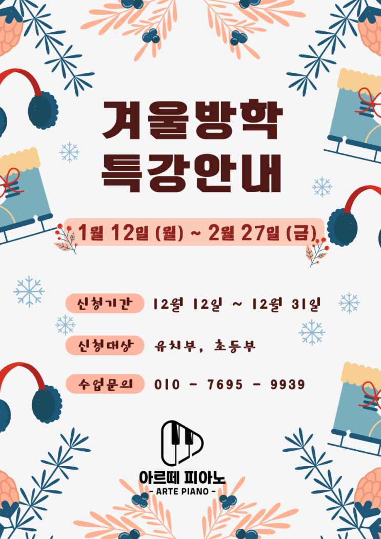 안녕하세요:) 아르떼 피아노입니다 이제 곧 있으면 우리 아이들의 기나긴 겨울방학이 시작되죠^^ 춥다고 집안에만 있을 수 없죠!!! 방학은 단순히 휴식기간이 아닌 보다 앞서 나갈 수 있는 황금 같은 자기개발의 기회라고 생각합니다. 따뜻하고 힐링 되는 공간에서 누구보다도 더 알차고 두뇌를 깨울 수 있는 성장의 기회를 만들어 보는 건 어떨까요? 아르떼 피아노에서 시작해 보세요 유튜브 연결링크 #아르떼피아노 #군포시당동 #동아아파트상가2층 #당동피아노 #군포초피아노 #유치부부터성인까지 #누구나즐겁게배울수있는곳 #겨울방학특강 <img src="https://blogthumb.pstatic.net/MjAyNTEyMTFfMTk1/MDAxNzY1NDMyNzI0NDI2.3W0uFhYP7AfrHUqlx8awKtxGTPc_ohaiQ162aS0KxgMg._s7GnZu5jb7g_NmMfF9sYX8SaM-W0ZTFghTaLQFnolcg.PNG/900%A3%DF1765432115132.png?type=s3" />