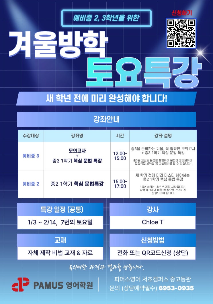 예비중 2,3 학년을 위한 특강을 다음과 같이 개설하였으니, 시간표를 보시고 신청 바랍니다. 비재원생 신청 문의는 학원으로 연락 주시면 별도 안내 드리겠습니다. 진짜 실력은 시간적 여유가 있는 방학 때 기를 수 있습니다! 특강 기간 1/3 (토) 개강 ~ 2/14 (토) 종강. 총 7회 특강 입니다. 특강 강좌 예비중 2 특강 [15:00-17:00] : 중2 1학기 <핵심 문법> - 모의고사 2회분 별도로 추가하여 수강 가능. (1/3, 1/10) 예비중 3 특강 [12:00-15:00] : 중3 1학기 <핵심 문법> + 모의고사 담당 강사 및 교재 Chloe T *강사 소개 <Chloe (클로이) 선생님> - 연세대학교 (신촌) 졸 - 세화여중, 서문여고 졸 - 좋은책 신사고 등 온....... <img src="https://blogthumb.pstatic.net/MjAyNTEyMDVfMTg1/MDAxNzY0OTMwMTYxOTk5.l90NwDSFI1j8w8tXjwXzjKAUz0dBtcLN_Nkfwr1t_zMg.IvIDNI8cTnVaRA8Q5yMxdlPltlmHq9pb16H35EvOr-Ig.JPEG/%C1%A6%B8%F1%C0%BB_%C0%D4%B7%C2%C7%D8%C1%D6%BC%BC%BF%E4_%284%29.jpg?type=s3" />