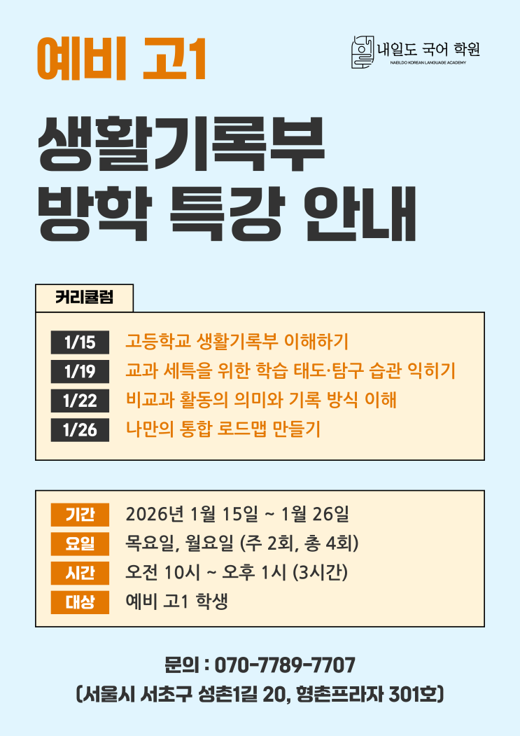 안녕하세요, 내일도 국어학원입니다. 고등학교 입학을 앞둔 학생들을 위해 <겨울방학 생활기록부 특강> 수강생을 모집합니다! 본 과정은 '내일도 국어학원에 재원 중인 예비 고1 학생들'만을 대상으로 진행합니다. 커리큘럼 학생부종합전형은 장기간 차곡차곡 쌓아올리는 노력이 필요합니다. 그러나, 방향을 못 잡고 무작정 쌓아올리면 엉뚱한 결과로 흐르게 됩니다. 학종은 어떤 전형인지, 생기부는 어떻게 구성되어 있는지, 어떤 생기부가 좋은 생기부인지 등 예시와 함께 나만의 통합 로드맵을 완성해보세요! ▶ 수업 목표 및 특징 고등학교 생활기록부 이해하기 - 고등학교 생활기록부의 전체 구조와 기록 항목을 정확히 파....... <img src="https://blogthumb.pstatic.net/MjAyNTEyMTFfMjIw/MDAxNzY1NDIyMDc4NzYx.WbLKMSVkOkqKPiI7elnnwhWkTw72hKPAh8Oc0L18wq8g.Ea7S3hcC0fatqmdIOeQLMEBCqFDkzOGlGL4vHzNf6X4g.PNG/%B0%AD%C0%C7_%C6%F7%BD%BA%C5%CD_%B4%EB%C7%D0%C0%D4%BD%C3_-_%C7%D0%BB%FD%BA%CE%C1%BE%C7%D5%C0%FC%C7%FC_%B4%EB%BA%F1%B9%DD.png?type=s3" />