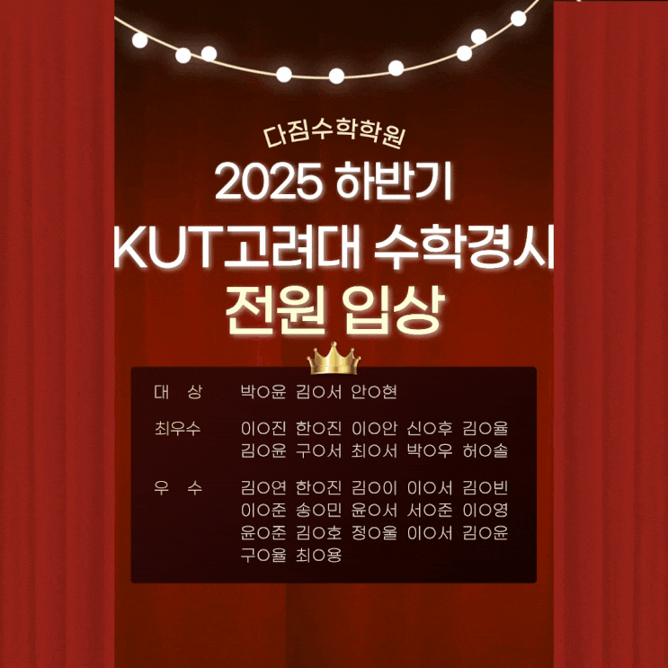 안녕하세요! 오늘은 다짐수학학원의 자랑스러운 소식을 전해드립니다. 바로 2025 하반기 KUT고려대 수학경시대회에서 전원 입상이라는 놀라운 결과를 이루어냈습니다! 노력과 열정으로 똘똘 뭉친 다짐수학학원 학생들의 쾌거를 함께 축하해주세요! 수상자 명단 ️ 대상 : 박○윤, 김○서, 안○현 최우수 : 이○진, 한○진, 이○안, 신○후, 김○율 김○윤, 구○서, 최○서, 박○우, 허○슬 우수 : 김○연, 한○진, 김○이, 이○서, 김○빈 이○준, 송○민, 윤○서, 서○준, 이○영 윤○준, 김○호, 정○울, 이○서, 김○윤 구○율, 최○웅 노력은 결코 배신하지 않습니다 이번 수상은 학생 한 명, 한 명의....... <img src="https://blogthumb.pstatic.net/MjAyNTEyMTdfMjAz/MDAxNzY1OTcyMjg3MTA1.Dklal7B3qwMoo0G-N6TUgXWjkSIytstMWKDxXcUtxUkg.DVyJwjJH3IqRVhZYzDHi8kK_8miVbWWItMDqDcS1c7og.GIF/%C1%A6%B8%F1%C0%BB_%C0%D4%B7%C2%C7%D8%C1%D6%BC%BC%BF%E4..gif?type=s3" />