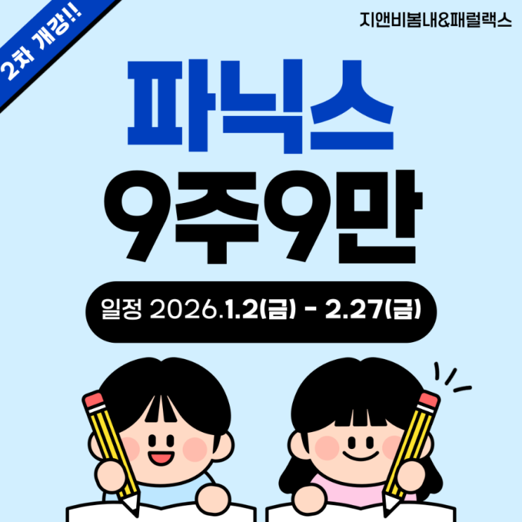 공지사항 ✔️ 1월 2일 OPEN! 9주 9만 파닉스 신규 모집 ⏰ 수업 시간 오후 4:40 대상 예비초1(7세) ~ 초3 / 선착순 모집 교육비 9주 9만원 (교재비·차량비 별도) 내 아이 첫 영어, 지금이 ‘명품 파닉스’ 시작할 타이밍! 지앤비 파닉스는 알파벳 쓰기 단모음 / 장모음 이중모음 / 이중자음 / 혼합자음 간단한 자기소개 표현 까지 9주 동안 완성합니다. 파닉스를 배우면? ✓ 단어를 ‘소리 원리’대로 읽고 ✓ 어휘력이 쑥쑥 올라가고 ✓ 영어 자신감이 확실히 UP! 신청 방법 지앤비 원생 형제 우선 접수입니다. 댓글에 학교 / 학년 / 이름을 남겨주세요. 예) 봄내초 2학년 지경민 추후 오리엔테이션 안내 드립니....... <img src="https://blogthumb.pstatic.net/MjAyNTEyMDVfMjY0/MDAxNzY0OTMxNDk1MDEx.aFkadb7BdDxQGyk0qRn9cqz4kKDV3dn2MF94wO-eGtUg.fFZKJjpK585Vsh5EQZp3cFfRodF9Ni3xVdKm0BjRcaQg.PNG/900%A3%DFBandPhoto%A3%DF2025%A3%DF12%A3%DF05%A3%DF19%A3%DF42%A3%DF38.png?type=s3" />