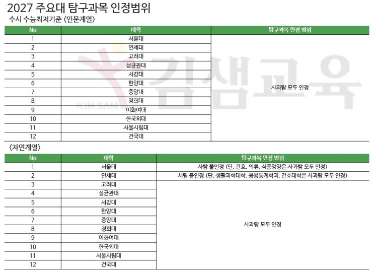 2027 대입, 사탐 vs 과탐, 선택이 합격을 좌우 (출처=한국경제 생글생글) 2027학년도 대입에서는 ‘사탐런’ 전략이 수험생들에게 중요한 선택지로 떠오르고 있음. 특히 서울대, 연세대, 고려대를 비롯한 주요 12개 대학의 수시 전형에서는 인문계열 지원 시 사회탐구와 과학탐구를 모두 인정하는 구조이기 때문에, 과탐에 부담을 느끼는 자연계 학생이라면 사탐을 선택하는 것이 충분히 효율적인 전략이 될 수 있음. 실제로 자연계 학생이 인문계열로 교차지원하는 길도 열려 있어, 내신과 학교생활기록부에서 전공 적합성을 잘 드러낸다면 합격 가능성을 높일 수 있음. 다만 서울대와 연세대 자연계열 일부 학과는 수시에서도 사탐을 인정....... <img src="https://blogthumb.pstatic.net/MjAyNjA0MTZfMSAg/MDAxNzc2MzA0NzY1MDM2.fAGx3qf1b9uUHtF3Tn-re6VibTpsr_bP095TJJFKWh0g.vrl4L3Qiy4AfZogsCU5Ft9JDxn2nTB5k4r8otFz4mn4g.JPEG/1.jpg?type=s3" />