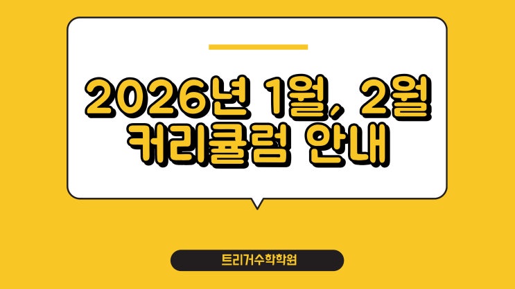 안녕하세요? 트리거수학학원입니다. 다가오는 2026년 1월, 2월 커리큘럼 안내해 드리겠습니다. 먼저 중등부 정규반 커리큘럼 안내입니다! 매 주 네이버 밴드로 학부모님께 자녀의 테스트 결과 및 수업 진행현황을 알려드리고, 선행 수업은 학생 하나 하나에 맞춰 진행합니다. 고등학교 1학년 커리큘럼입니다. 고등수학을 처음 시작하는 학생들도 잘 따라올 수 있도록 개인 수준별 첨삭을 진행하고, 트리거 어플을 이용하여 3월 모의고사 대비도 같이 진행합니다. 3월 모의고사는 중등 전체 범위이므로 중학교에서 배운 핵심적인 내용을 트리거 어플을 이용하여 복습합니다. 고2 커리큘럼 입니다. 문제풀이 특강은 개별적으로 교재를 선정하거나, ....... <img src="https://blogthumb.pstatic.net/MjAyNTEyMTFfMjQ3/MDAxNzY1NDM3ODQyNzY4.BUNUY4kJtjoH3j2HhcUh7hMP6yaB5ugC0fg8hu5Etq0g.HWQn-dCYqFPhI8UyqkF7H5wjASYAOQ5d33vlON21FFEg.JPEG/001.jpg?type=s3" />