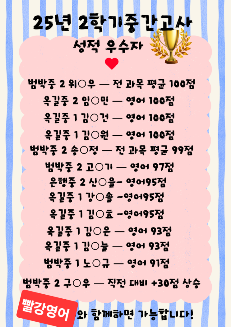 방배동 영어학원 방배파머스영어 지니원장입니다 이번 1~2월 겨울방학 동안 진행되는 초등 고학년 문법·서술형 집중특강 안내드립니다. 📘 매주 월요일 특강 수업 구성 ✔ Grammar 집중 학습 + 서술형 문장 쓰기 ✔ 주 3편 Story Reading & Comprehension Test 매주 월요일은 아이들의 문장 구조 이해력, 리딩 기초 체력, 그리고 서술형 쓰기 능력을 키우는 데 집중하는 날입니다. ■ 특강 수업 내용 안내 1) 문장 구조 분석 (Sentence Structure Analysis) 문장의 1~5형식을 정확히 구분하고, 문장에서의 주어·동사·목적어·보어·수식어 역할을 눈에 보이게 정리합니다. 문장 구조가 보이면 리딩 속도와 정확도, 말하기가 동시에 올라갑니다. 많은 학부모님들이 리딩 속도만 고민하시지만, 실제로는 “문장 구조가 보이느냐”가 실력 향상의 결정적인 지점입니다. 2) TO 부정사 완전 정리 to부정사를 명사처럼 쓰일 때(주어·목적어·보어) 형용사처럼 쓰일 때 부사처럼 쓰일 때 로 나누어 예문과 함께 정확하게 정리합니다. to부정사의 쓰임만 제대로 이해해도 리딩 지문의 이해도와 문장 해석력이 급격하게 달라집니다. 3) 서술형 문장 쓰기 훈련 아이들이 배운 문장 구조·to부정사 개념을 가지고 직접 문장을 변환·확장·재구성해보며 서술형 문장 쓰기를 진행합니다. ✔ 개념 → 구조 → 나만의 문장 만들기 이 흐름이 정확히 잡혀야 중학교 서술형 대비가 완성됩니다. 4) 매주 Story 3편 읽기 + 독해 테스트 주간 숙제는 스토리 3편 읽기이며, 수업 시간에 각 스토리당 5문항의 독해(comprehension) 테스트를 진행합니다. 스토리를 단순히 읽고 끝나는 것이 아니라, 문장 구조와 어휘, 핵심 문장을 다시 잡아주기 때문에 읽기 실력이 훨씬 단단해집니다.