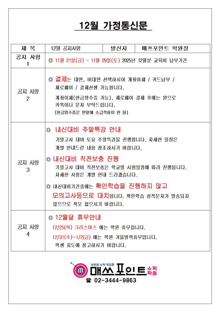 수미사 중계관] 은행사거리 수학학원 겨울방학 특강안내
