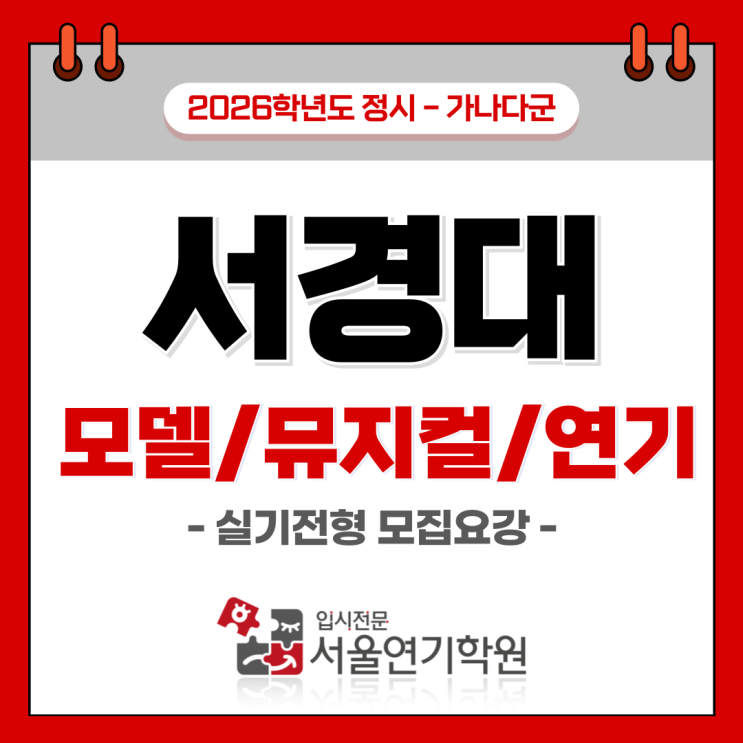 안녕하세요. #샤연기학원 #SAA연기학원 #SAA #일산연기학원 #주엽연기학원 #서울연기학원 #서울연기학원추천 #부천연기학원 #인천연기학원 #운정연기학원 #경기연기학원 #부평연기학원 #고양연기학원 #김포연기학원 #파주연기학원 #은평연기학원 #홍대연기학원 #뮤지컬입시 #연극연출입시 #예고입시연기 #입시전문서울연기학원 #연기입시학원 #연기학원 과 관련된 모든특기수업을 1:1 레슨으로 메인특기는 매주 1시간씩 운영하는 입시전문서울연기학원입니다. 오늘은 #2026학년도 #정시 #서경대 #서경대학교 #모델연기전공 #뮤지컬전공 #연기전공 #입시모집요강을 알려드립니다. #입시일정 원서접수: 12/29~12/31 모델연기 1차실기일정: 2026/01/....... <img src="https://blogthumb.pstatic.net/MjAyNTExMjZfMjA4/MDAxNzY0MTUyMTA1MzM5.vLKOK-b2HUIh4N_KNbPLvaHqxuHc9M7EV87Rf7UX8xAg.RCVa_fmNEI5uMh6d6KnCOVrCVpoDiPHNIOphT4rMkaEg.PNG/%C1%A6%B8%F1%C0%BB-%C0%D4%B7%C2%C7%D8%C1%D6%BC%BC%BF%E4_-002.png?type=s3" />