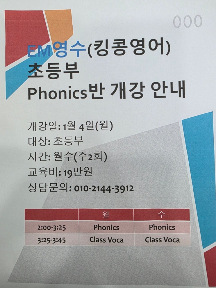 26년 1월 5일 초등부 Phonics반이 새롭게 시작합니다. 많은 관심 바랍니다. <img src="https://blogthumb.pstatic.net/MjAyNTEyMTJfMTc3/MDAxNzY1NTM0MDQ5OTUx.jV5Ubr4a7IseCevyJSyTrA-n8pW1cU5qxRuGuP3iwHUg.UD0sjjM7hAxBNGdGQKOt6B6YAABl3TVk6gHV58zGA1kg.JPEG/KakaoTalk_20251212_190656385.jpg?type=s3" />