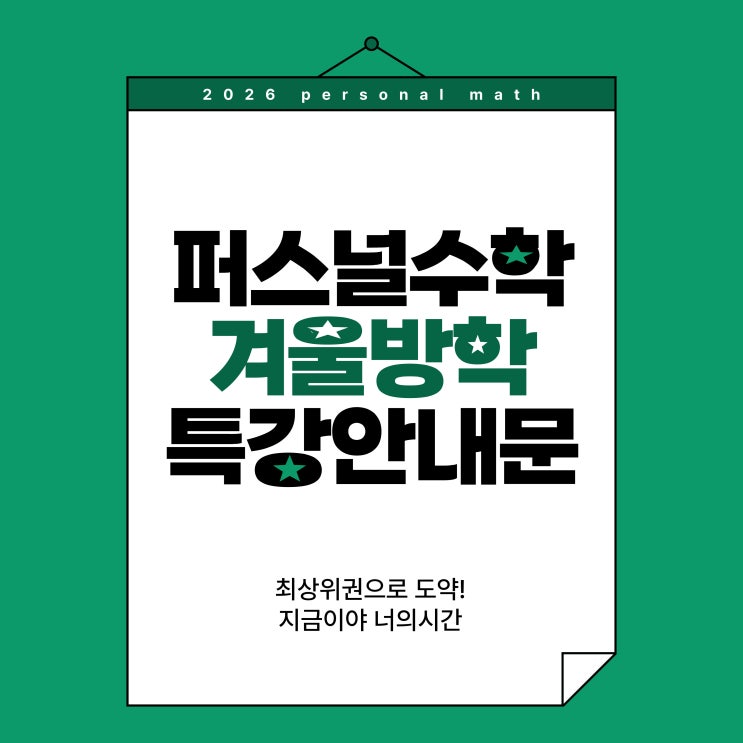 안녕하세요 거제동/사직동 개별맞춤전문 수학학원 퍼스널 수학입니다. 겨울방학은 26년 일년에 대한 과정을 결정하는 중요한 시기이며, 고1과 고2는 많은 개념진도가 진행되는 기간입니다. 매일 성장하는 우리학생들의 겨울방학은 너무나 중요하기에 [퍼스널수학학원]에서 학생들을 위한 특별한 강의를 준비하였습니다. 우리학생들이 성장하는 시간이 되기를 바라며, [퍼스널수학학원]에서 진행되는 겨울방학특강일정을 안내드리겠습니다. 겨울방학특강은 1월 5일부터 2월25일까지 두달간 진행되며, (2/2(월) ~ 2/6(금) 학교개학주간, 2/16(월) ~ 2/18(수) 설 연휴에는 특강이 없습니다.) 26년 겨울 특강은 아래 QR로 신청 가능하며, 학원으로 전....... <img src="https://blogthumb.pstatic.net/MjAyNTEyMTJfMjIx/MDAxNzY1NTIyMzI0OTc0.6yYd86tkWpEsrq9t1JcaXOMBxPgRapfiC0_smNUpvmMg.hQofr1_a0IzIfDtXuIiFxNVnBvfiDme25K3G6cUCmVEg.JPEG/26%B3%E2_%B0%DC%BF%EF%C6%AF%B0%AD_1.jpg?type=s3" />