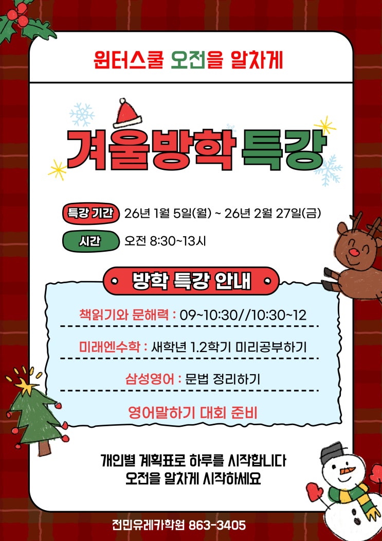 안녕하세요, 전민유레카학원입니다 어느덧 2학기가 끝나가고, 아이들이 기다리던 겨울방학이 다가왔습니다. 우리 아이들이 그동안 열심히 공부한 만큼, 이번 방학은 ✔ 잠시 쉬어갈 수 있는 시간 ✔ 스스로 성장하는 시간 ✔ 새로운 학기를 준비하는 시간 이 되어야겠지요? 전민유레카학원은 아이들이 건강하고 안전하게 겨울방학을 보낼 수 있도록 학원 운영을 잠시 쉬어갑니다. 하지만! 방학이 끝나면 더욱 알찬 프로그램으로 돌아옵니다. 겨울방학이 끝나면, 더욱 탄탄하게! 방학이 끝난 뒤에는 아이들의 실력을 한 단계 더 끌어올릴 겨울방학 특강이 기다리고 있습니다. 책읽기 & 문해력 향상 수업 새 학년 선행 미래엔수학 영어종결센터....... <img src="https://blogthumb.pstatic.net/MjAyNTEyMDlfMTgx/MDAxNzY1MjY4MjE0NzI4.07O5wWserp8Io-wGYYsbSkorelrL-IfJL6u7Hzx1b9Qg.NwXfKbUVYSjKFvu2uck8W6qORiXnLaVR6usn3Hfrwlog.JPEG/125.jpg?type=s3" />