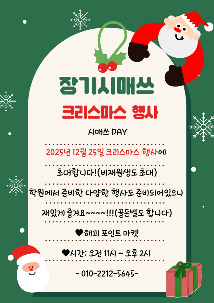 보고 만지고 소통하며 수학의 즐거움을 체험하기! 행사 안내 일시: 2025년 12월 25일 (목) 오전 11시~ 오후 2시 대상: 재원생과 친구 및 동생 모두 장소: 장기시매쓰학원 올해도 열심히 공부한 우리아이들! 선생님들은 우리 학생들이 즐겁게 체험할 수 있도록 보드게임 등 여러 가지 수학을 즐겁게 체험할 수 있도록 준비했습니다 한 해 동안 차곡차곡 모은 포인트를 사용해 보며 아이들이 성취감을 느낄 수 있는 참여형 행사입니다 ❤️어떤 활동을 할까요? ✔️도전 골든벨 행사(12시 정각) ✔️ 선물.떡볶이, 치킨 간식 먹기 ✔️ 보드게임, 활동해 보기 ✔️포인트 교환 상점 시매쓰 데이 행사는 즐거운 게임과 간식 등 친구들과 함께 오....... <img src="https://blogthumb.pstatic.net/MjAyNTEyMTFfMTAz/MDAxNzY1NDI4MzU2MjY5.kGPspBFSXs2qgesIxdmnmj9ckKLgGbRHIwvKUTlxQ8wg.KxWeLlLtR045fSUOtQChquXsvYUsHj2Dk1b3m1NT-XAg.PNG/%C1%A6%B8%F1%C0%BB_%C0%D4%B7%C2%C7%D8%C1%D6%BC%BC%BF%E4._%2811%29.png?type=s3" />