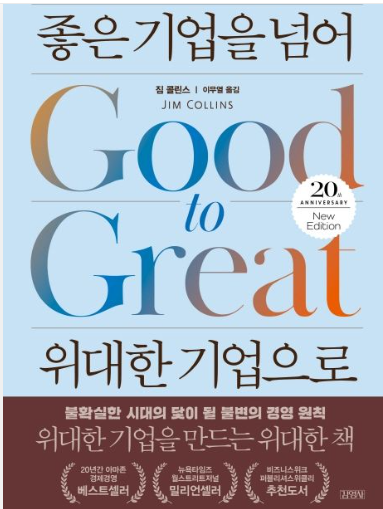 안녕하세요? 오늘은 짐콜린스의 '좋은 기업을 넘어 위대한 기업으로'라는 책을 소개하고자 합니다. 저는 한마음 영수학원을 운영하는 소상공인입니다. 하지만, 항상 좋은 학원으로 정말 사회에 미미하지만 좋은 영향력을 제공하는 학원으로 인식되기를 바라는 마음으로 학원을 운영하고 있습니다. 이런 이유로 이 책을 이달의 도서로 선정하였습니다. 저와 같은 마음을 가졌거나 이 책 내용이 궁금하시다면 함께해 주세요. 데이터로 증명한 ‘위대함’의 조건 짐 콜린스의 『좋은 기업을 넘어서 위대한 기업으로』는 성공한 기업들의 사례를 감각이나 운이 아닌, 장기간의 데이터 분석을 통해 설명하고 있어서 더 믿음이 갔습니다. 저....... <img src="https://blogthumb.pstatic.net/MjAyNTEyMTRfMjYw/MDAxNzY1NzIwMzE0NDU5.72svTRrcW_PCmaPwcXIOHjBkGb7gJmYy-lbKLRgyZb4g.YSJfBTBfdcyC_HzZvOIDEzqTAoj_shvpTB2tHAO8JYQg.PNG/image.png?type=s3" />