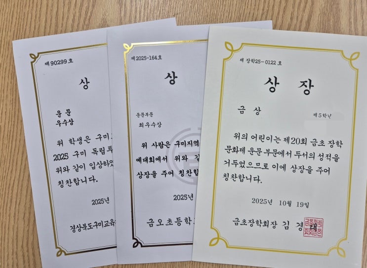 안녕하세요 ~ 올해 책나무 아이들이 외부 글쓰기 대회와 교내 대회에서 다수의 상장을 받았습니다. 책나무에 다니면 우리 아이도 상을 받을 수 있을까요? 1년 내내 이어지는 외부대회 수상은 ‘실력의 누적’ 책나무는 단기 스킬을 가르치지 않습니다. 꾸준히 책 읽고 → 생각 정리 → 글로 표현하는 습관을 운은 반복되지 않습니다. 반복되는 것은 실력입니다. .교내 대회 수상은 ‘탄탄한 기본기’의 증거 교내 대회는 준비 기간이 짧고, 즉흥적으로 쓰는 경우가 많습니다 그럼에도 책나무 아이들이 상을 받는 이유는 이미 기본 문해력·표현력·구조화 능력이 충분히 갖춰져 있기 때문입니다. 교내 수상 사진들을 보면 아이들의 문장력 · 구성력....... <img src="https://blogthumb.pstatic.net/MjAyNTExMjVfMTky/MDAxNzY0MDY1Nzk2OTI1.4z1YHojGf0o0Mz0qwZKqhukaSkiUWKAfe6qI-2eGVx8g.GDUQrip-ImmRC5iMwOGe1V-V7-1JNFwDL-UBHdWuDp0g.JPEG/1.jpg?type=s3" />
