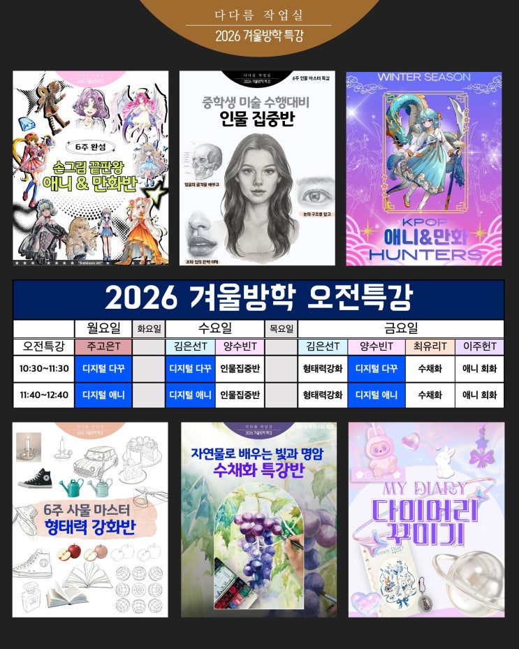 !! 다다름 작업실 2026 겨울방학 특강 !! 많은 학부모님들이 먼저 기다려주신 다다름 시그니처 특강수업 ♥️ 이번 겨울방학, 그냥 시간만 채우는 ‘방학 특강’이 아니라 아이의 ‘미술 근육’을 제대로 키워주는 6주로 구성하였어요. 방학은 매년 오지만, 지금 이 나이에 맞는 방학은 단 한 번뿐이에요. 이번 겨울만큼은 “어영부영 지나간 시간”이 아니라, 아이의 실력이 눈에 보이게 자라는 6주로 채워주셨으면 해요. 다다름 작업실 겨울방학 특강은 재미로만 끝나는 수업이 아니라 인물 소묘, 형태력, 수채화, 애니&웹툰, 디지털 드로잉, 굿즈 제작까지 아이의 미술 근육을 차곡차곡 쌓아가는 커리큘럼으로 준비했습니다. 이제, 우리 아....... <img src="https://blogthumb.pstatic.net/MjAyNTEyMDlfMTY3/MDAxNzY1MjYwNjQ0MTU0.yGg-nwmQ_ScUBdf2lhB7LqcW4nPqp2IXhO8UzM3Xxosg.V03HwnVgbg5-ArcIPWKMQURAPrWS-1JDCmQbM8EYgpYg.JPEG/2026_%B0%DC%BF%EF%B9%E6%C7%D0%C6%AF%B0%AD-2.jpg?type=s3" />