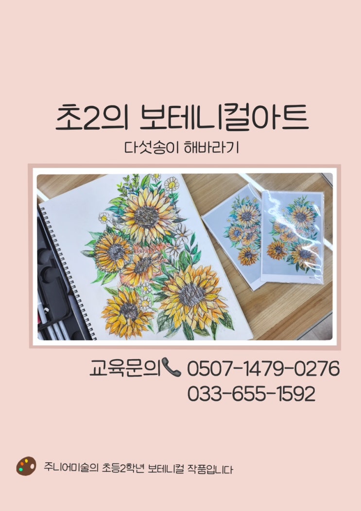 마루화실을 운영하며 가장 큰 보람을 느끼는 순간은, 아이들이 수업 시간에 쌓아 온 경험이 자기만의 작품으로 또렷하게 완성될 때입니다. ‘아이의 경험이 하나의 이야기로 남는 수업’ 아이 한 명 한 명의 속도와 성향을 존중하는 수업은 그렇게 시작됩니다. 이번에 소개드리고 싶은 수업은 초등학교 2학년의 보테니컬 아트, ‘다섯 송이 해바라기’입니다. 보테니컬 아트는 단순히 꽃을 그리는 활동이 아닙니다. 관찰을 통해 형태를 이해하고, 반복되는 선과 색을 통해 집중력을 기르며, 작은 디테일까지 끝까지 완성해 나가는 인내심을 키워 줍니다. 특히 아이들에게는 ‘천천히, 자세히 본다’는 경험 자체가 큰 배움이 됩니다. 관찰이 중심....... <img src="https://blogthumb.pstatic.net/MjAyNTEyMTNfMTEy/MDAxNzY1NTkxMDQzMjI0.ZEEcm9wkDN9wBRcFpNdoyp2ShLc_vJI2okDveuXDgMQg.GjYYGYIpcv4IG21ZnNbQDA7uf3_SxqHPaZxMuONmwgMg.JPEG/IMG%A3%DF2710.JPG?type=s3" />