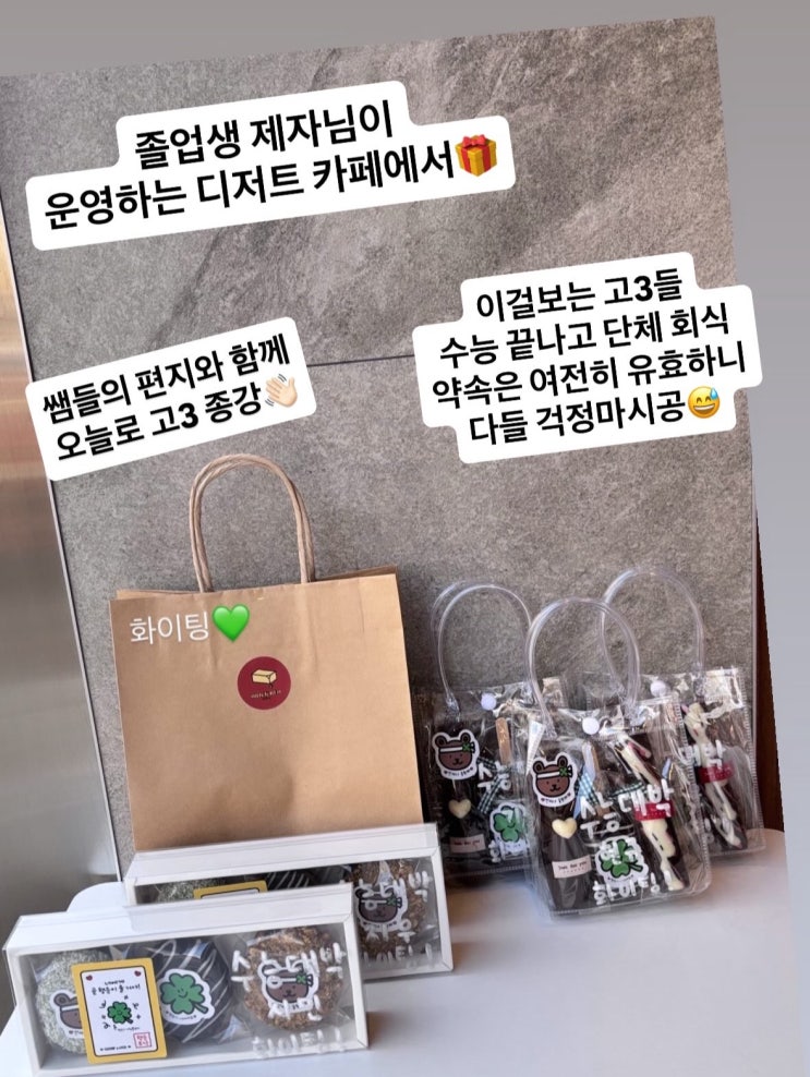 (1) 11월을 끝으로 종강한 고3!!! 제자님이 직접 운영하는 카페에서!!! 원장놈이 학원 운영 10년 만에 처음으로 고3들에게 소박한 선물(?)을 끝으로 고3과 종강을 했습니다!! (원래는 초콜릿 사탕 안사주고 졸업식 전 후로 다 같이 비싸고 맛있는 식사로 대체하는 편...^^) 졸업생 제자님이 사장으로 있는 '브릭레드 신암' 동대구역 근처 카페인데 진짜 순수 내돈내산으로 자주 방문해서 원장놈도 먹는 중!!! 디저트들 완전 추천!!!! 제가 보증합니다!!! 불만족시 제가 환불 해드림!!! (2) 졸업생 제자들의 방문 (3) 수능 친 고3님들과 가볍게 식사 1) 하양여고3 딸내미들과 대명쌤 집에서 식사타임 2) 원장놈 혼자 밥먹기 싫어서 놀고....... <img src="https://blogthumb.pstatic.net/MjAyNTEyMjBfMjY0/MDAxNzY2MjEzNTg2NDA3.jeeR0udf2QA8RW8Z2zLEdcMlcBHiZ-jM4thpQQ8rwZ0g.1N8wjoNKJUJCPiIOuCPhyf7iOxPimJS7muLswZPdBtcg.JPEG/KakaoTalk_20251220_154051147.jpg?type=s3" />