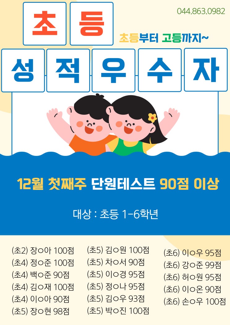 [다정동 라인수학학원] 초등부 12월 첫째주 90점이상 성적우수자 안내