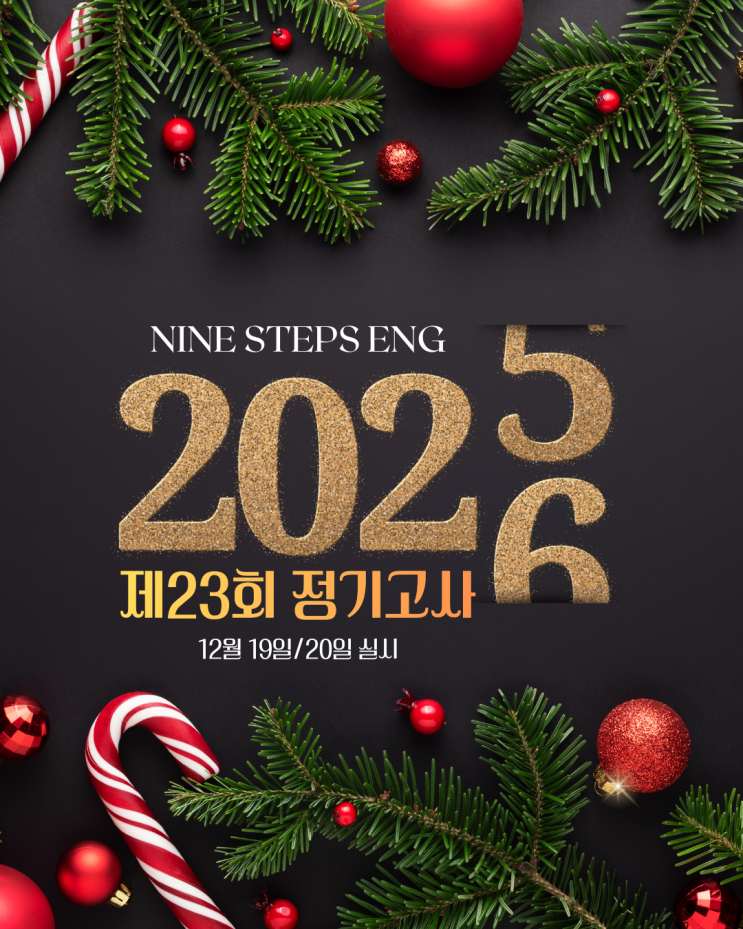 일부 학교 중1 학생들과 중2 학생들이 내신기간으로 막 바쁜 한 주를 보내고 있는 와중에, 나인스텝스 영어학원의 다음주는 정기고사로 치러집니다. 아래의 포스터들을 잘 참고하시어, surprise 23회 정기고사를 잘 치를 수 있길 바랍니다! ▲ 다음주에 정기고사에서 필요한 독해 지문을 배부 할 예정입니다. **특히 E유형의 시험을 치르는 중3 친구들은 23년도 9월 고1 모의고사로 다음주 정기고사 변형 문제들을 풀게 될 예정**입니다. 이번주 위클리 때 위 모의고사로 시험을 한 번 치르고 다음주엔 고등학교 내신 시험 유형으로 바뀐 변형 문제들을 정기고사로 풀 예정이니, 이번주 위클리 테스트가 특히나 중요하겠습니다. ^^ 또한 초등부 ~....... <img src="https://blogthumb.pstatic.net/MjAyNTEyMTBfMTg4/MDAxNzY1MzYwNjk1NzM2.ehGAcqDN3L4CaG3WHEUsVxlv-CQT4zqQg_wMuKz7tj0g.2RHToMbPC45NZck1ruqS5dR4zJe8feadvI8CWMg4Xwwg.PNG/KakaoTalk_20251210_184445676.png?type=s3" />