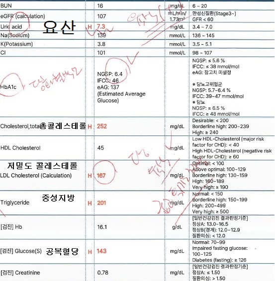 다이어트를 고민하는 딸에게 늘 하는 말.. 이런 말을 하는 내가, 당뇨 진단을 받아서..ㅡㅜ 딸은 내 말을 전혀 믿지 않지만, 이제 알아보자. 위험수치가 나온 것은 이 페이지에서는 5가지.. 그 외에도 혈압이 높다. 일단.. 이 부분은 가족력이 강한데, 나는 외가 친가 모두 고혈압이시다. 고혈압패밀리들은 이런 특성을 가진다. 70대까지 장기들은 다들 쌩쌩하다. 암발생이 별로 없다. 무조건 혈관건강이 문제. 고혈압, 당뇨, 고지혈증 이 3가지 셋트로 인한 증상인 심장마비.. 또는 신부전 나는 요산수치가 높긴하지만, 신부전쪽은 아직 별 문제 없고, 심장마비는 두단계, 협심증 이후 심근경색인데, 협심증은 한두번 겪어봤는데, 1층에 컴포즈....... <img src="https://blogthumb.pstatic.net/MjAyNTEyMDlfMTkg/MDAxNzY1Mjg0NDQ3NDU0.FGxj6vknStSdcAGOUZK8f4dRmU76XVbjh91NxsFEOq0g.OI4f11aRvcUFQy1vYb3wi4uL5lub16YkGitiYQZoIqwg.JPEG/%B4%E7%B4%A2%BA%B4.jpg?type=s3" />