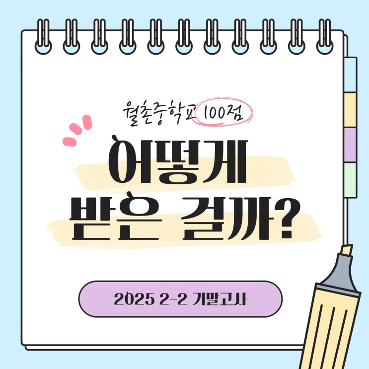 저희 교습소 학생이 저번 시험에는 아쉽게 수학에서 97점을 받았었는데.. 이번에는 다행히 100점을 받았습니다. 중간고사가 어려웠어서 그런지 이번 기말고사는 생각보다 쉽게출제가 되었습니다. 저 개인적으로는 이렇게 열심히 준비했는데 쉽게 나와서 오히려 조금 아쉽더라고요... 그래서 이번 포스팅은 월촌중 시험을 대비하는 팁을 알려드리는 시간을 갖도록 하겠습니다. 1. 특징 몇 년치 월촌중 시험지를 살펴보다 보면 조금씩 특징이 있습니다. - 한 학기에 적어도 한번은 시험이 많이 어렵다. - 아주 긴 문장 혹은 매우 많은 보기 중에서 올바르거나 올바르지 않은 보기를 고르는 문제가 있다. - 모의고사 유사 문제가 있다. 다른 학교와....... <img src="https://blogthumb.pstatic.net/MjAyNTEyMTRfNjcg/MDAxNzY1NjY0OTQ2Mzk3.JyuAjc6hF0kJ6aI6OWV3LBl1HkzDn64n5nhy25qWjsEg.rA5yXMMo4HIcL1k36IAUc_qEXqR8MmYPW4O4WcyU6Ycg.JPEG/%BF%F9%C3%CC%C1%DF_%B1%E2%C3%E2%BA%D0%BC%AE_page-0001.jpg?type=s3" />