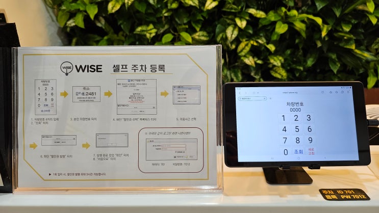 안녕하세요~! 와이즈입니다.~*.* 오늘은 저희 와이즈 스터디 카페. 독서실 회원님들 주차방법에 대해 안내해 드리도록 하겠습니다. 와이즈 스터디 카페. 독서실, 스터디룸 고객이라면 최대 3시간까지 무료주차 가능하오니 셀프 등록을 통해 편하고 쉽게 주차 등록하실 수 있습니다. 저희 와이즈 프리미엄 스터디 라운지 리셉션으로 오시면 셀프 주차 등록을 하실 수 있도록 준비해 두었습니다! 주차 등록 방법을 순서대로 알려드리도록 하겠습니다. 1. 모니터에 차량 번호 4자리 입력 2. 조회 버튼 터치 3. 본인 차량번호 터치 4. 할인권 선택 터치 5. 이용 시간 선택 6. 할인권 발행 터치 (발행 후 ' 처음으로' 버튼 터치 부탁드립니....... <img src="https://blogthumb.pstatic.net/MjAyNTEyMTJfMTUz/MDAxNzY1NTIwOTc3MTYx.zGQakEO8rPvKUAU_dn7nXpg2rFP9BsTHX_YKYtkPNy8g.f82H6zzO2EVH9qNU1mCtAzAjflVCIO6u0iCzPGc4jrwg.JPEG/KakaoTalk_20230623_103447103.jpg?type=s3" />