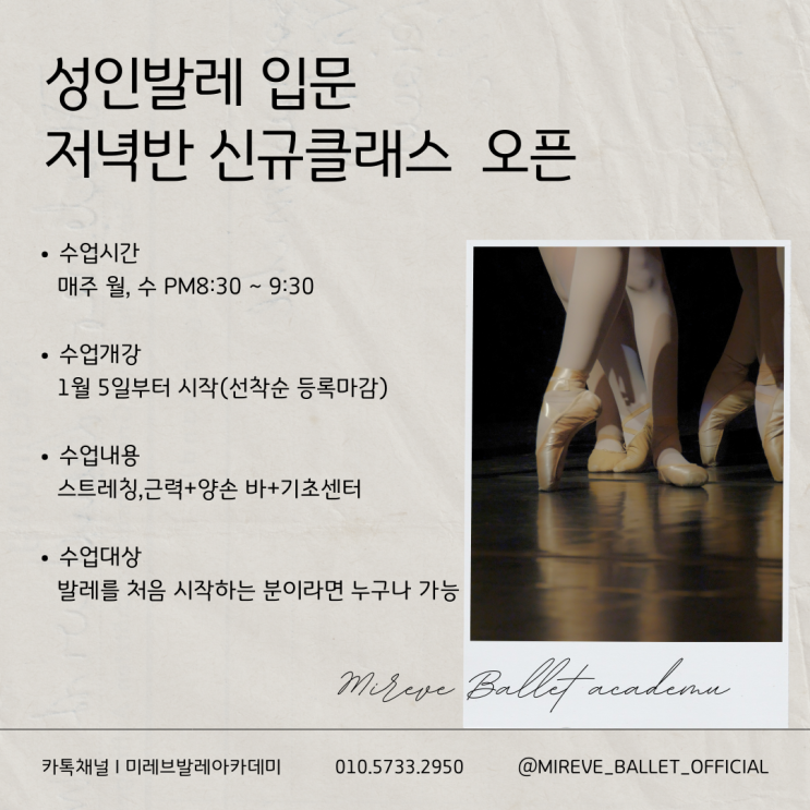 ✨ 성인발레 입문 저녁반 신규 클래스 오픈! 마감되는 입문반이 생기면서 감사하게도 기다려주시겠다는 분들이 계세요♥ 그래서 저녁입문반을 추가개설 하게되었습니다~^^ 미레브 발레 아카데미에서 성인 초보자를 위한 발레 입문 저녁반을 새롭게 엽니다. 발레 경험이 전혀 없어도 괜찮아요! 기초 스트레칭부터 몸을 바로 세우는 바(barre) 훈련까지, 차근차근 따라갈 수 있는 커리큘럼으로 구성된 수업입니다. 수업시간 매주 월, 수 PM 8:30 ~ 9:30 퇴근 후 부담 없이 참여하기 좋은 시간대예요. 수업 개강 1월 5일부터 시작 선착순 등록마감이니 미리 예약등록 해주세요_! 수업 내용 발레를 처음 시작하는 분들이 가장 어려워....... <img src="https://blogthumb.pstatic.net/MjAyNTExMjhfMSAg/MDAxNzY0MzAwNzY4OTM4.gsFhcIVxfdkgSuNvLdpQV6SkW8oMjyE-6SFcoOuxne0g.uL9q4e18jOn2M0_C4ExJy0K4iUvDVMgd6eRnrlWcMKMg.PNG/image.png?type=s3" />