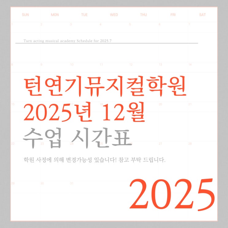 안녕~~~ 반가워요^^ 오늘은!! 턴연기뮤지컬학원의 12월 시간표를 공지합니다!! 12월은 기말 시험도 있고 크리스마스도 있고 이제 곧 시작될 방학과 새해를 기다리는 마음이 가득한 월이죠?? 요즘 너무 독감이 유행이고 다들 감기로 아프다는 친구가 많아지고 있어요ㅜㅜ 옷 따뜻하게!! 마스크 꼭 착용!! 건조하지 않게 습도 유지!! 건강하게 만나요^^ 문의 : 051 363 8893 인스타그램 : @turn_acting_musical 유튜브 : https://www.youtube.com/@turnacting2021 카카오톡 오픈 채팅 : https://open.kakao.com/o/sRgpz9md <img src="https://blogthumb.pstatic.net/MjAyNTEyMDFfMTI1/MDAxNzY0NTgxNTczODU3.12RrvvcIKRgCNkAknmhlAlmYts5HGxtStvU9Obmvx0Eg.NlZvP2BDw1m3tVDgSIcmriyG-V2g7Ov6TLC2FFKUr2Eg.JPEG/%BD%C3%B0%A3%C7%A5%C7%A5%C1%F6_-001_%281%29.jpg?type=s3" />