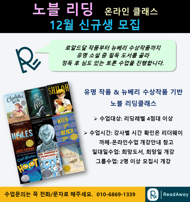 리더웨이 / 온라인 영어원서리딩 <뉴베리수상작> Novel Reading Class-12월 신규 수강생 모집