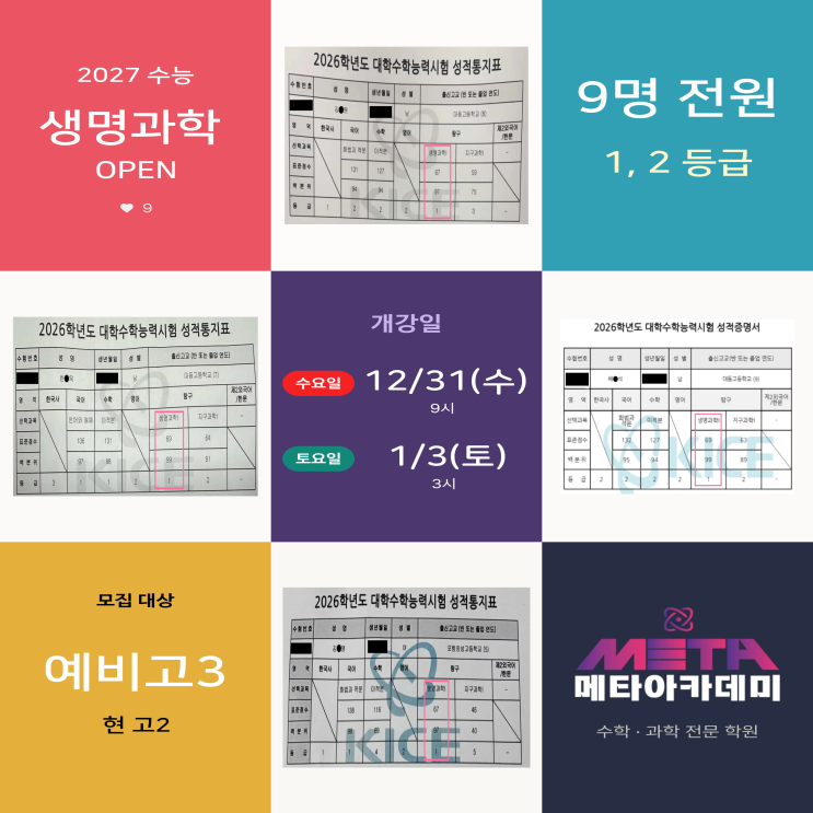 수학, 과학 전문학원 메타아카데미입니다. 26수능을 우수한 성적을 받게한 그 수업! 어서 신청하세요! 12월 31일 수요일 9시 개강! 1월 3일 토요일 3시 개강! <img src="https://blogthumb.pstatic.net/MjAyNTEyMTRfMjEz/MDAxNzY1NzIzNzE4MDk1.03OHH_aXpIaw2gYNfaocSoY5ByRx2e3wpwOpwa8L6EMg.i9CnR90vVm8XdqiYzPHV6c80EBPjPy7a4utgbORNTaYg.PNG/meta_3x3_final.png?type=s3" />