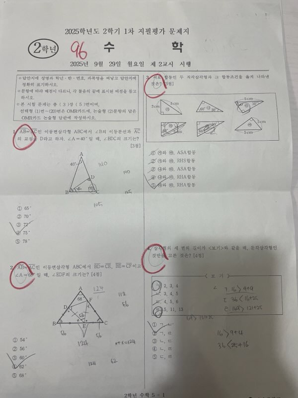 1. 시험 개요 이번 시험은 삼각형의 합동과 평행사변형의 성질 및 판별 단원을 중심으로 구성되었습니다. 총 22문항(객관식20문항 +논술형2문항)으로 이루어져 있으며, 개념 이해형 30%, 계산 및 응용형 50%, 사고형 20%의 비율로 출제되었습니다. 2. 단원별 문항 분석 ① 삼각형의 합동과 내심, 외심 - 주요 개념: 합동 조건(ASA, SAS, RHS, RHA), 내심·외심의 성질, 각의 이등분선 - 출제 의도: 합동의 기본 조건 및 대응 관계, 내심과 외심을 이용한 각 관계 계산 능력 평가 - 난이도: 중상 - 유사 교재: 쎈 중2(하) B단계 1139~1169, 개념원리 2-2 p.127~137, 마더텅 2학기 p.97~102 - 특징: 계산보다는 도형 해석 및 보조선 설정 능력 평가....... <img src="https://blogthumb.pstatic.net/MjAyNTExMTFfNSAg/MDAxNzYyODI3Njk1MjQ1.VARtGcS0D-tejKIKzlE3Yy-AELbRwO0YUskgJgST_pUg.XmbkZuO-mk4gR5YKzuFzxIa_wYvfUxGGPxJ2AxMvt7Yg.JPEG/1.jpg?type=s3" />