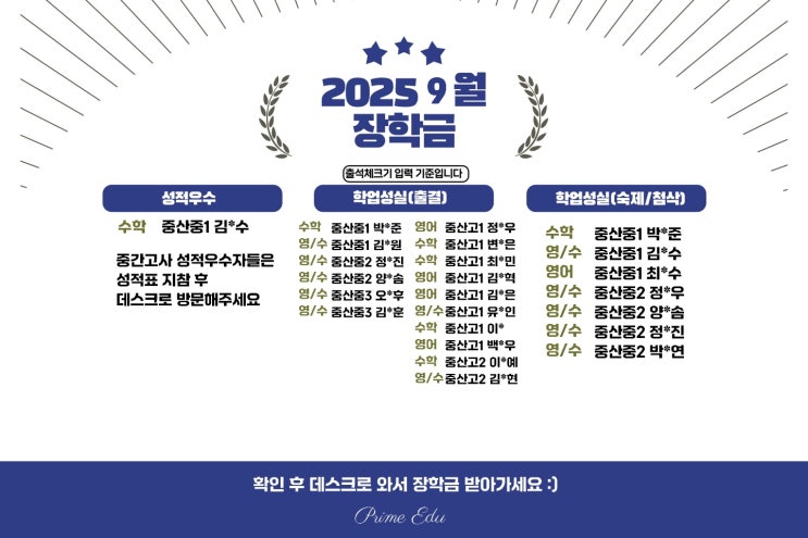 중산중,중산고 전문 프라임에듀 9-10월 장학금