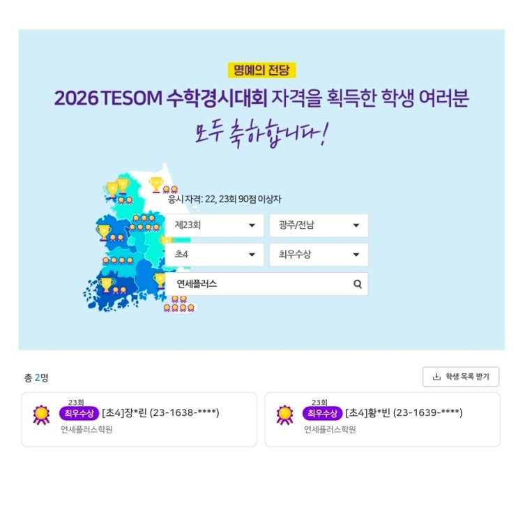 안녕하세요^^ 연세플러스 학원입니다.!! 우리아이들이 도전한 테솜시험, 그리고 그 도전을 통해 더욱 성장한 친구들을 학부모님들께 기쁘게 소개합니다^^ 먼저, 많은 분들이 궁금해하시는 테솜시험! 어떤 시험인지부터 알아볼까요? 테솜시험이란 무엇인가요? 테솜(Test-SOM) 은 학생들의 사고력·추론능력·문해력·수리적 사고를 종합적으로 평가하는 전국 규모 사고력 경시대회입니다. 단순한 암기형 문제가 아니라, 주어진 정보를 스스로 분석하고 새로운 관점으로 접근해보고 논리적 사고로 해결해야 하는 ‘진짜 사고력’을 기르는 문제들로 구성되어 있습니다. 이 때문에 매년 많은 학부모님들께서 아이들의 사고력 향상과 성장을 위해 선....... <img src="https://blogthumb.pstatic.net/MjAyNTEyMTJfMzQg/MDAxNzY1NTExMTY1MTA5.d9csUwg7yyyp6Mp-uuRkCn9Jonez_lyPBHVRm9Y4Aeog.qcrjLmYu1IT5wNoT6TivoqTLT8oxXGsy41liSGouL3wg.JPEG/%C5%D7%BC%D8_%B8%ED%BF%B9%C0%C7_%C0%FC%B4%E7.jpg?type=s3" />