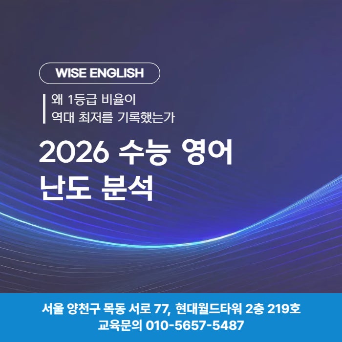안녕하세요. 양천구 목동에 위치한 와이즈영어는 학생들이 영어 문장을 정확히 이해하고, 지문 내용을 자연스럽게 읽어낼 수 있도록 돕는 수업을 제공합니다. 단순한 문제 풀이가 아니라, 학생 눈높이에 맞춘 맞춤 지도와 이해 중심 수업으로 차근차근 실력을 쌓아가며, 영어에 대한 자신감과 흥미를 함께 키울 수 있는 환경을 만들어 줍니다. 올해 2026 수능 영어는 많은 학생들에게 예상을 뛰어넘는 충격을 안겼습니다. 시험 직후 가장 많이 나온 말이 “영어가 이렇게 어려울 수가 있나?” 였을 정도로 난이도 체감이 크게 올랐고, 평소 안정권이던 학생들마저 흔들리며 전체적인 성적 분포가 크게 재편되었습니다. 함께 알아보러 가실까요? 역....... <img src="https://blogthumb.pstatic.net/MjAyNTEyMTFfMjY0/MDAxNzY1NDM5MjMxOTA3.ACBnYqGk5FX2sqIyh4FXniTtPhFrIKv2gcA0VFeg3Ucg.VroJLwYCUIj5sxcJyy0eYFkaLARywuWebtPsAGnBOLwg.JPEG/2026_%BC%F6%B4%C9_%BF%B5%BE%EE_%B3%AD%B5%B5_%BA%D0%BC%AE_%281%29.jpg?type=s3" />