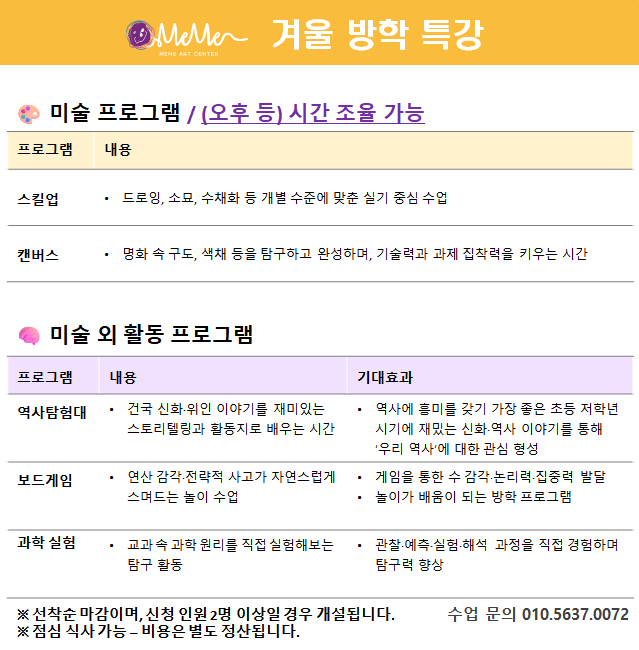 안녕하세요! 미미아트센터 입니다. 겨울방학, 봄방학 오전시간 선생님, 친구들과 함께 다양한 주제로 탐구하고 활동할 수 있는 겨울방학 특강이 개설 됩니다. 점심급식, 오후수업 추가 연강 가능합니다. 더 자세한 안내시간표는 010-5637-0072 문자로 문의 바랍니다. 감사합니다. <img src="https://blogthumb.pstatic.net/MjAyNTEyMDNfNzkg/MDAxNzY0NzQyNDgyNzIw.8KkEVunwAmoFc4HVVjEvGXf-oQ6mJNf_vVGKZK07dTgg.2UaSzh4RC1y-3V4q5bo8bqlObc7OHZ4wi_qv_aK1DWkg.PNG/1764742464082.png?type=s3" />
