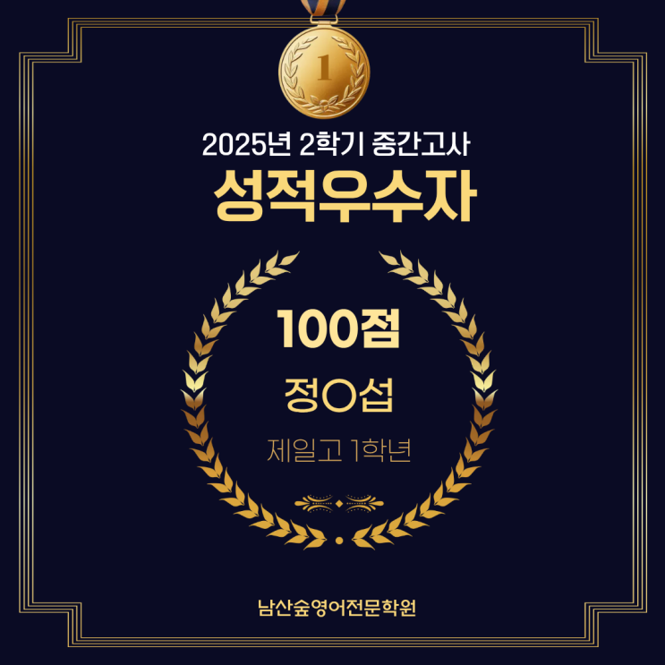 안녕하세요, 에밀리입니다 남산숲영어전문학원에서 2025년 2학기 중간고사 영어 성적우수자 소식을 기쁘게 전해드립니다. 이번에도 우리 학생들이 정말 자랑스러운 성과를 보여주었고, 각자의 자리에서 묵묵히 해낸 노력들이 빛을 발했습니다. 학부모님들께서도 함께 축하해주시면 좋을 것 같아 이렇게 소식을 남깁니다. 2025년 2학기 중간고사 영어 성적 우수자 발표 1등 — 정O섭 학생 (100점 만점) 완벽한 점수, 말 그대로 퍼펙트 스코어입니다. 기초 문법과 독해부터 고난도 서술형까지 모든 영역에서 안정적이면서도 정교한 실력을 보여준 학생입니다. 평소 수업에서도 꼼꼼한 복습, 피드백 반영 능력, 문제를 보는 시선까지....... <img src="https://blogthumb.pstatic.net/MjAyNTExMjFfNDEg/MDAxNzYzNzA2MTMxNTgy.jDYVFLL1tcLmXlFa5vf9rPmjOTdv9bOxSeRxuxFKXhUg.UBQw9PbfNQadhAgb1UAsEO95yrnhHLCwl7SqYWigWkMg.PNG/1.png?type=s3" />