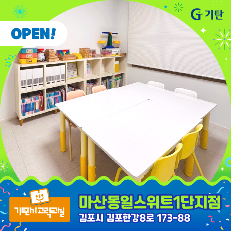 안녕하세요 기탄사고력교실입니다. 이번에 김포시 마산동에 기탄공부방이 새롭게 오픈했습니다. 아이들이 편안하게 머물며 스스로 배우는 힘을 기를 수 있는 공간을 만들어 주셨기에 지역 학부모님들께도 기쁜 소식을 전해드립니다. 깔끔한 마산동 기탄공부방 새롭게 오픈한 마산동 기탄공부방은 아이들이 편안하게 앉아 몰입할 수 있는 학습 환경을 가장 먼저 고려하여 설계되었습니다. 밝은 조명과 화이트톤의 책상, 포인트가 된 노란색 의자는 아이들에게 안정감을 주고, 공간 곳곳에 배치된 교구와 교재는 아이들의 눈높이에 맞추어 정돈되어 있습니다. 개방감 있는 구조를 활용하여 아이들이 편안하면서도 집중이 잘 되는 분위기 속에....... <img src="https://blogthumb.pstatic.net/MjAyNTEyMDFfMjE2/MDAxNzY0NTc2OTcwMDQz.2LrSHIOo_dUKP_yEB6qhoeC2RCTXYKVnJdziavkHTxog.eRX0WDK2YuEg7Z0nFR8M1MyJ2xCJp3gAM_Gn4QVHsqQg.PNG/2512_02_%C1%A4%B9%E6%C7%FC_%B8%B6%BB%EA%B5%BF%C0%CF%BD%BA%C0%A7%C6%AE1%B4%DC%C1%F6%C1%A1.png?type=s3" />