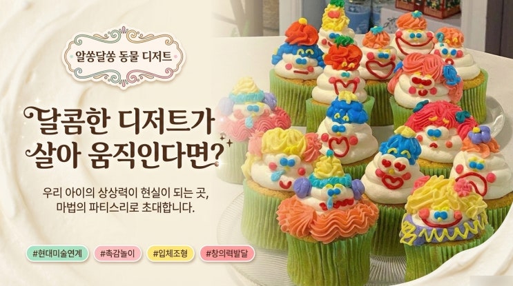 세종 유아 원데이클래스, 어린이날 오감을 깨우는 요리미술! 달콤한 상상이 동물이 되는 [동물 디저트] 지난 10여 년간 아이들의 눈높이에서 예술을 연구하고 지도해온 원장으로서, 5월 어린이날이 다가오면 참 설렙니다. 다가오는 어린이날, 세종시 학부모님들은 벌써부터 "이번엔 또 어떤 특별한 경험을 선물해 줄까?" 고민이 많으실 거예요. 사실 저도 매년 5월이 되면 고민이 깊어집니다. "단순히 예쁜 결과물을 가져가는 수업을 할 것인가, 아니면 아이의 머릿속에 질문을 남기는 수업을 할 것인가" 하는 문제 때문이죠. 오늘 소개해 드릴 [동물 디저트] 요리미술 원데이 클래스는 그 고민 끝에 탄생한, 우리 아이의 &#....... <img src="https://blogthumb.pstatic.net/MjAyNjA0MjBfODkg/MDAxNzc2NjkxMDI2Mzgx.4iM8OwlOKqsLuXxkroK7wwxsdRdwZSAOIyUpIDR2racg.bDcSOzKv2Rp7WetXjQ3wOACQnCi23NsqcFgXbCUUZJAg.JPEG/Magical_Animal_P%26acirc%3Btisserie_1.jpg?type=s3" />