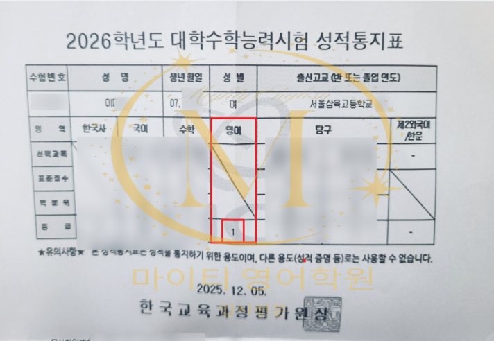 안녕하세요. 마이티 인창동 영어학원 원장 오희교 입니다. 2026학년도 수능 성적표가 공식적으로 나왔습니다. 영어 1등급 비율 3.11%, 말 그대로 영어는 불? 아니 지옥 수능이었습니다. 하지만, 마이티 고3 아이들은 달랐습니다. 각 학생 원점수 94점(상위 1.2% 추정), 95점(상위 0.8%) 추정이라는 엄청난 결과를 가져왔습니다. 1등급을 아득히 넘는 점수를 가져왔습니다. 그중 한 학생은 심지어 저희 학원에 처음 들어왔을 때, 모의고사& 내신 등급이 5~6등급대였는데 정말 인간승리라고 부를 수 있는 점수를 획득하였습니다. 도대체 이 불수능에, 어떻게 이런 점수가 가능했을까요? 영어를 감으로 풀지 않고, 논리로 풀었기 때문입니다. 백....... <img src="https://blogthumb.pstatic.net/MjAyNTEyMDlfMiAg/MDAxNzY1MjcyODYyMDYy.AI41VbrZbYfQ75MbGmZ3QnzoAGTTX7wVtAGHXRsfgpQg.mlEUw4nVRsNleJVrO-8vlNY_wguCslHFTKpeNspczkEg.PNG/2025_%BC%F6%B4%C9%BC%BA%C0%FB_%C0%CE%C1%F5_%C0%CE%C3%A2%B5%BF_%BF%B5%BE%EE%C7%D0%BF%F81.PNG?type=s3" />