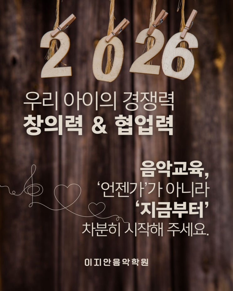 많은 부모님들이 이렇게 말씀하세요. "언젠가는 꼭 악기 하나 배워보게 하고 싶어요." 하지만 이 '언젠가'라는 말이 아이의 음악교육을 가장 멀리 밀어내는 단어가 되곤 합니다. 2026년을 바라보는 지금, 왜 음악교육을 더 이상 미루면 안 되는지 두 가지 키워드로 정리해 보겠습니다. 1️⃣ 미래 직업 세계가 요구하는 것 : "창의력 + 협업력" 이제는 지식 그 자체보다, 지식을 어떻게 연결하고 새롭게 조합하느냐가 중요한 시대입니다. AI가 많은 정보를 정리해 주고, 문제 풀이를 도와줄 수 있지만, 전혀 다른 사람들과 함께 새로운 결과물을 만들어내는 힘은 여전히 인간의 영역입니다. 음악교육, 특히 악기와....... <img src="https://blogthumb.pstatic.net/MjAyNTEyMTJfMTUx/MDAxNzY1NTAwOTMyMzI2.hoNH3FEiUrBwmjj2gFwqi9hn2ZDWB6AJTs0ZSxyqJ2og.s3YOiuYHHKPHLrQfOIqlI6eWDKSEK1RtvZr7PusnB0kg.JPEG/IMG%A3%DF7392.JPG?type=s3" />