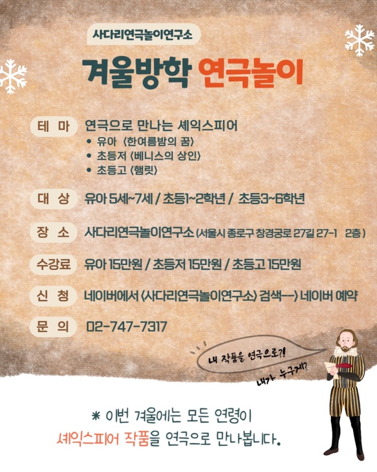 2026 사다리연극놀이연구소 겨울방학 연극놀이 모집을 시작합니다! 이번 겨울에는 모든 연령이 셰익스피어 작품을 연극놀이로 만나 봅니다~ 초등고(3~6학년) : <햄릿> * 일시 : 1월 9, 16, 23일(금), 오전 10시30분-12시 30분 초등저(1~2학년) : ⚖️ <베니스의 상인> * 일시 : 1월 9, 16, 23일(금), 오후 2시30분- 4시 30분 유아(5~7세) : <한여름밤의 꿈> * 일시 : 1월 27, 28, 29일 (화~목), 오후 2시-4시 수강료 : 15만원 신청 : 네이버에서 '사다리연극놀이연구소' 검색 ->네이버 예약 문의 : 02-747-7317 #사다리연극놀이연구소 #사다리연극놀이 #연극놀이 #교육연....... <img src="https://blogthumb.pstatic.net/MjAyNTEyMTBfNTIg/MDAxNzY1MzQ0MDUxNDE2.KiIJvQtA3legIZL_F2GAFTAllLnX9m0jt6S2FKLUSxMg.dHbiemrSGmC7Kq3ds2zpWvYHF_xOZ7EYAh34TpJcdTIg.JPEG/IMG%A3%DF3829.JPG?type=s3" />