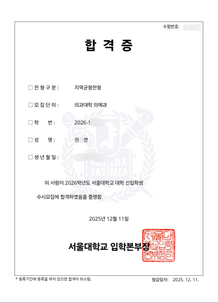 W영어학원 창립4년만에 드디어 최고의 입결!! 2026년 서울대 의예과 합격생 배출!!!! . 대치동W영어 달서분원(직영) www.wenglish.co.kr 어제, W영어학원 권*연 학생이 서울대 의대 수시 합격이라는 큰 결실을 이루었습니다. 그 외 고려대, 연세대, 가톨릭대 의대 합격도 있습니다!!! 대치동 최상위 1%의 힘은 결국 방향을 아는 학습에서 비롯됩니다. 대치전문 25년 초중고 오랜 경험에서 나온 *멘토링*과 W영어의 ‘초등의 사고력 → 고등의 결과’로 이어지는 체계적 학습 시스템 속에서 학생은 자신의 길을 흔들림 없이 걸어갔습니다. 영어 실력은 물론, 사고력, 기록력, 학습 태도, 입시에서의 마지막 결단까지. “한 학생을 끝까지 책임진다....... <img src="https://blogthumb.pstatic.net/MjAyNTEyMTNfODMg/MDAxNzY1NTU5NTM3NzUz.adRqu20WdP3LUGeqX2gu5KZ2dyczmGQ4CAOrih3vO-0g.lrWr6D0KgMUTTyTL6CGg8yWglECf4F4251J0iHfJmoQg.JPEG/1765558720390.jpg?type=s3" />