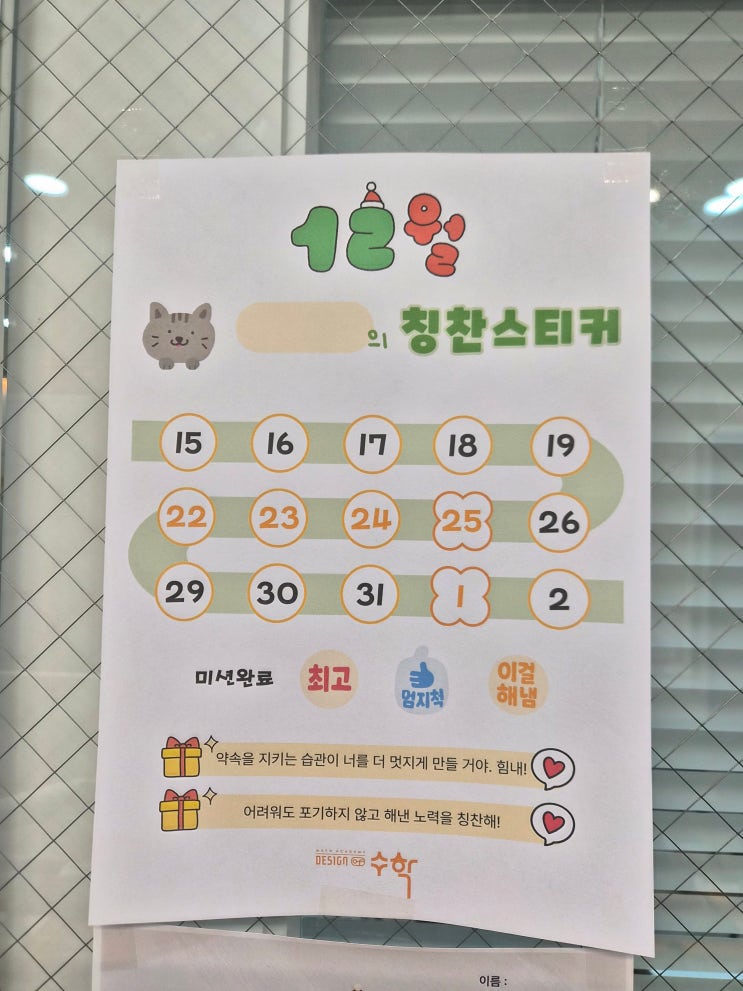 칭찬 스티커 이벤트 안내 연말이 가까워질수록 아이들 집중력이 흐트러지기 쉬운 시기입니다. 그래서 달서구 수학학원 디자인오브수학에서는 겨울방학을 앞둔 이 시기에 아이들이 공부 태도를 자연스럽게 유지할 수 있도록 작은 칭찬 이벤트를 준비했습니다. 수업 중 열심히 참여했을 때, 숙제를 성실히 해왔을 때, 집중해서 끝까지 문제를 풀었을 때, 아이들의 이런 모습들을 놓치지 않고 칭찬 스티커로 바로 표현합니다. 눈에 보이는 칭찬은 아이들에게 “내가 잘하고 있구나”라는 작은 자신감을 만들어줍니다. 스티커 하나를 모을 때마다, 오늘의 작은 선물 달서구 수학학원 디자인오브수학의 칭찬 스티커는 모아서 끝나는 이벤트가 아....... <img src="https://blogthumb.pstatic.net/MjAyNTEyMTdfMTgx/MDAxNzY1OTYzMjQzNTIy.HWMhAwQManni2jC7K0KQkBJnZsl7dHNLMIV7Wb2D624g.GXNwf6wSAw3SG6xJImv12jJoyAVNxtHF7ete17ierkEg.JPEG/KakaoTalk_20251217_182002512.jpg?type=s3" />