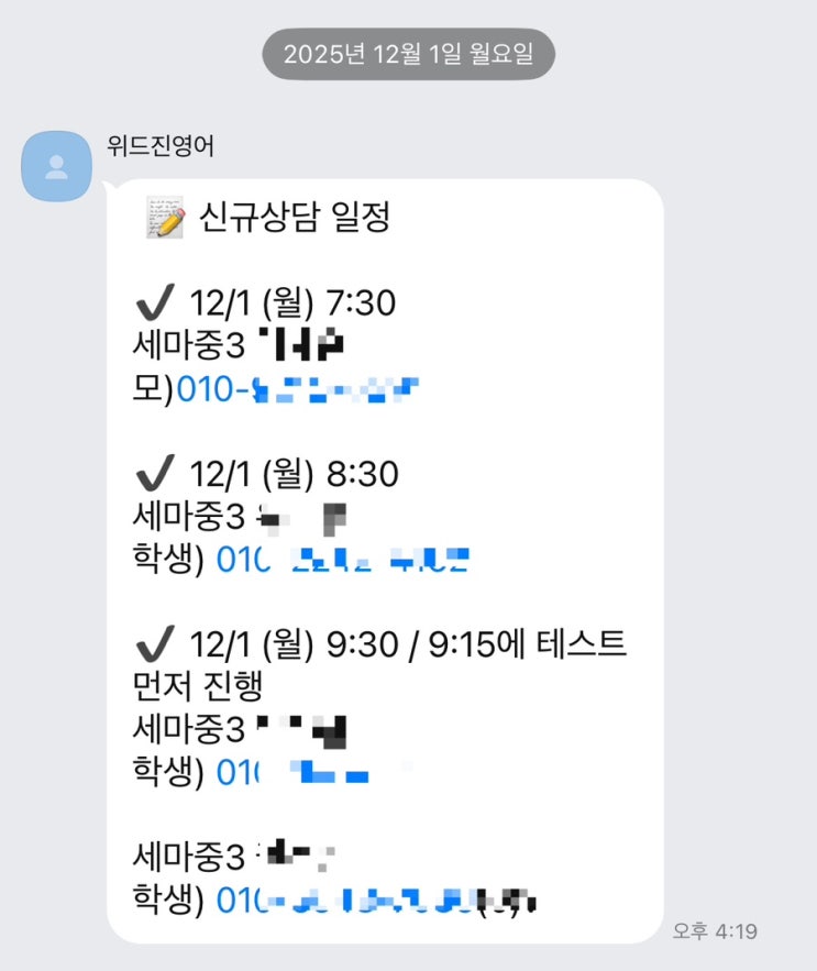 안녕하세요. 위드진영어의 꼼꼬미진쌤입니다 예비고1 영어 수업 찾고 계신가요? 그 수요에 맞게 위드진영어도 12월 2일 예비고1 2개반을 오픈합니다. 미리 예비고1 수업이 진행되었던 월금 수업에 이어 이번에는 화목 수업으로 개설되며 이 두 반이 마감될 경우 다른 요일로 추가 개설됩니다. 하루에 4명의 학생을 만나 상담하는만큼 위드진영어의 예비고1 수업에 관심있는 학생들이 많은 것 같아 뿌듯합니다. 그중 위드진영어에 문의하고 상담하는 친구들의 대다수는 바로 [소개]인데요. “공부방 선생님께서 추천해주셨어요” “수학학원쌤이 추천해주셨어요” 라는 말을 듣고 있는 요즘입니다. 우리 학원의 재원생들의 소개가 가장 많지만....... <img src="https://blogthumb.pstatic.net/MjAyNTEyMDJfMTg1/MDAxNzY0NjA4NDExNzkw.wY9QA4KUwX8TJxlMyzdLEqhmxuFIqbZiXjSvTiPC0Isg.jB_uzRRc-U7VwGiKurpRBWSosbx-ClV9EXYVXhBf3Cwg.JPEG/output%A3%DF3364256588.jpg?type=s3" />