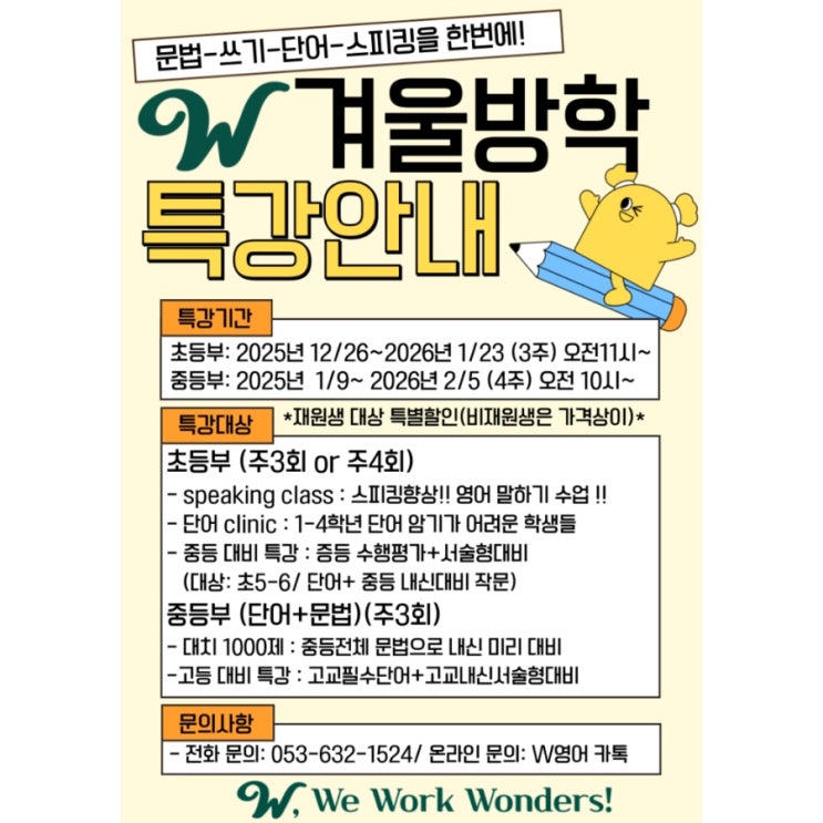 . . . ●W겨울방학 특강● 겨울방학을 활용해 아이들의 영어 실력을 단기간에 확실히 끌어올릴 수 있는 특강 프로그램을 합리적인 비용으로 준비했습니다. (외부 학생은 비용 다름!!) 특강의 구체적인 스케줄, 수업료, 레벨별 추천 반은 원으로 개별 문의 주시면 안내드리겠습니다. 감사합니다 . . 문의 053-632-1524 . . <img src="https://blogthumb.pstatic.net/MjAyNTExMjdfNTgg/MDAxNzY0MjAwNzYxNTI4.Oj3Ieycq7_nnBZi_2FNdhJpu97YLoSkl03G4OhZBMZkg.7Fy0yLYir5SG22OTY1umP_8gX-u_16_d1oK8L8531ugg.JPEG/900%A3%DF1764199134050.jpg?type=s3" />