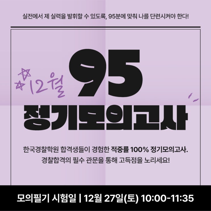안녕하세요 대구/경북 경찰공무원 압도적 합격률 1위 최근 6년 2,518명 이상의 합격률을 자랑하는 대구경찰공무원학원 한국경찰학원입니다 26년 상반기 1차 경찰시험까지 약 3️⃣개월 밖에 남지 않은 지금✨ 마지막으로 실전과 유사한 훈련이 필요한 시점입니다! 실제 경찰시험의 경우 100문제를 100분간 풀고 OMR 마킹까지 완료해야 합니다 또 실제 시험장에서는 심적으로 긴장된 상태로 응시하기 때문에 평소에는 하지 않던 실수를 하기도 합니다 한국경찰학원에서는 12월 정기모의고사를 통해 마킹 실수 최소화하고 시간 분배 연습을 위해 실제와 같은 100분 시험이 아닌, 보다 더 확실한 대비를 위해 5분 줄인 95분 경찰 정기모의고....... <img src="https://blogthumb.pstatic.net/MjAyNTEyMTdfMTg4/MDAxNzY1OTQ0ODQ1NTc2.JI0xKVHZqSs2q56hxgG31udDndTyATmGj7_kkx2N684g.HR94eSU8fYDYTDllEp_0cnRfvkCQoQppEpYXW8I3iz8g.JPEG/%C1%A4%B1%E2%B8%F0%B0%ED_%BA%ED%B7%CE%B1%D71.jpg?type=s3" />