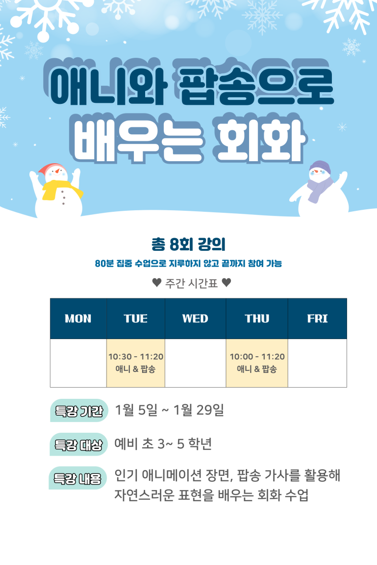 안녕하세요 ! 상현 파머스 어학원 입니다. 겨울 방학이 코 앞으로 다가왔어요 ~ 방학은 아이들이 영어 실력을 탄탄하게 만들 수 있는 가장 좋은 시기입니다. 저희 파머스에서도 올해 겨울방학 프로그램을 준비했습니다 ! 문법 기초를 확실하게 잡고 싶은 친구들부터 재미있게 회화를 배우고 싶은 초등 아이들. 말하기 실력을 끌어올리고 싶은 학생들까지 !! 각 수준과 목표에 맞춘 여러 특강이 마련되어 있습니다 ^^ 아래에서 특강 구성과 시간표를 자세히 알려드릴게요 ! 애니와 팝송으로 배우는 회화 영어를 놀이처럼 즐기고 싶은 초등학생 ! 딱딱한 교재보다 생동감 있는 수업을 좋아하는 아이들에게 추천하는 강의입니다. 인기 애니메이션 장....... <img src="https://blogthumb.pstatic.net/MjAyNTEyMDRfMzAg/MDAxNzY0ODQ2Mzc2NzE1.YRqQ1emQqJCGXifSbZdKa6kpr86KzKjFQLY92j5q9V0g.2phkXUWBQih-ag22DfutmRAulMxGbHQJZnSrG9s4RLkg.PNG/Untitled-design-001.png?type=s3" />