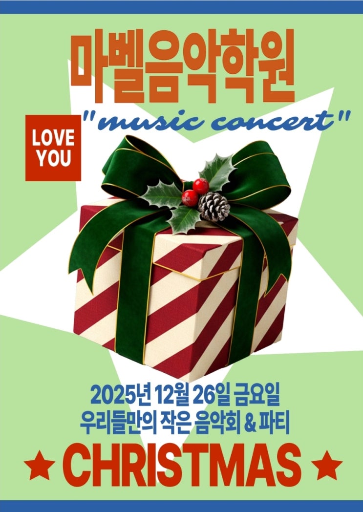 안녕하세요. 마벨음악학원입니다. 2025년 12월 26일 금요일 마벨 친구들만의 작은 음악회와 열심히 준비한 우리 아이들을 위한 파티를 합니다 고사리같은 손가락으로 건반을 치며 고개를 까딱거리며 박자를 맞추고, 발끝으로 리듬을 구르며 연주곡을 수 십번, 수 백번도 더 치며 고군분투하고 있는 우리 아이들 우리 아이들이 조금씩 성장하고 있음을 느낍니다 마벨 우리들만의 작은 연주회 & 파티 어디서? 마벨 음악학원 원내 시간은.. 2시~6시까지 문의.. 031-469-2226 선물같은 연주곡을 선사합니다! "우리 작은 천사들에게 행복하고, 따뜻한 음악을 배울 수 있도록 마벨음악학원이 함....... <img src="https://blogthumb.pstatic.net/MjAyNTEyMTJfNjIg/MDAxNzY1NTQ2MDY5MTM4.5gcxT7bbAONYRj6yVzzpL8rdGsIsen6GlJzRsi430qIg.ztn_sGco6hw7YrVYYS7x7tzrHDiTnbiT6JzaKZ920s8g.JPEG/900%A3%DF1765546053445.jpg?type=s3" />