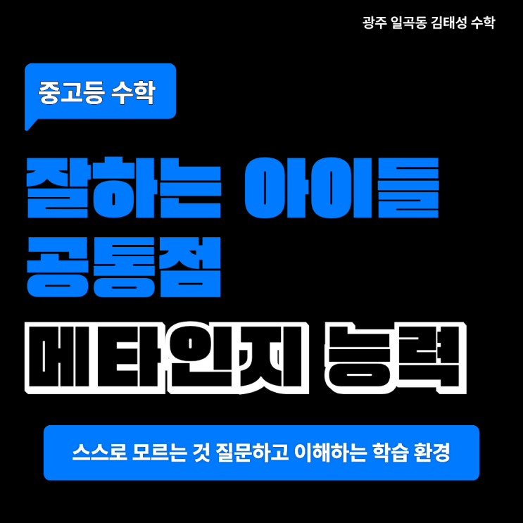 중고등 수학 잘하는 아이들 공통점? 메타인지 능력 키워야 하는 이유 안녕하세요! 광주 북구 일곡동 김태성 수학학원입니다. 학교에서 수업을 진행할 때, 학원에서도 마찬가지로 모르는 문제가 나오거나 잘 이해가 되지 않을때 자신있게 질문하는 아이, 과연 몇명이나 될까요? 보통은 그냥 넘어가는 경우가 많죠. 또 나중에 선생님에게 물어보는 아이들도 있지만 대부분 그것조차 까먹고 혹은 용기가없어 지나가곤 합니다. 이런 현상이 나타나는 이유는 아이들의 문제라기보다도 환경의 문제라고 생각합니다. 질문이 자유롭게 이뤄지는 분위기라면, 그 누구도 질문하기를 두려워하지 않을테니까요. 그래서 저희 김태성 수학학원은 질문....... <img src="https://blogthumb.pstatic.net/MjAyNjA0MjBfMTk5/MDAxNzc2NjgxOTI5NTEz.yXd193gZJfQ7huNSRuEAZVdF8iKEwLOOfjtROmpmLB4g.5gvxG1J0YRYhcPm10b3bAgszJYCAFK1vufBqvcbtDrwg.PNG/%B1%E8%C5%C2%BC%BA_%BC%F6%C7%D0_146.png?type=s3" />