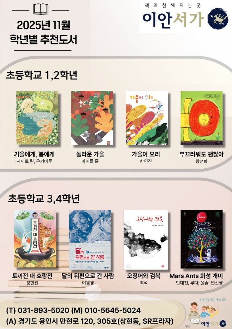 안녕하세요? 책과 친해지는 곳 이안서가 수지원입니다. 2025년 11월의 학년별 추천도서 안내해드립니다. 이안서가에서는 매주 1권의 책을 읽은 다음 그에 맞는 워크북을 작성해보면서 발표력, 문해력, 작문력 등을 길러나가고 있습니다. 앞으로도 책장을 넘길 때마다 피어나는 아이의 생각을 놓치지 않고 함께 키워가겠습니다. <이안서가 수지원>의 교육 프로그램에 대해 더 자세히 알고 싶으신 분들은 아래 번호로 문의주시기 바랍니다. 친절하게 상담해드리겠습니다. 감사합니다. <img src="https://blogthumb.pstatic.net/MjAyNTExMjdfMTE0/MDAxNzY0MjI4NDE2NjEw.Nu_NzAatTi7PqLQZMT6l4Gr-McSgEYKOJY0C90HaKmYg.OVzoo0Fgfg-TFnPm00_sMv8YY-Duld-ld9Ft9BBF060g.JPEG/11_14.jpg?type=s3" />