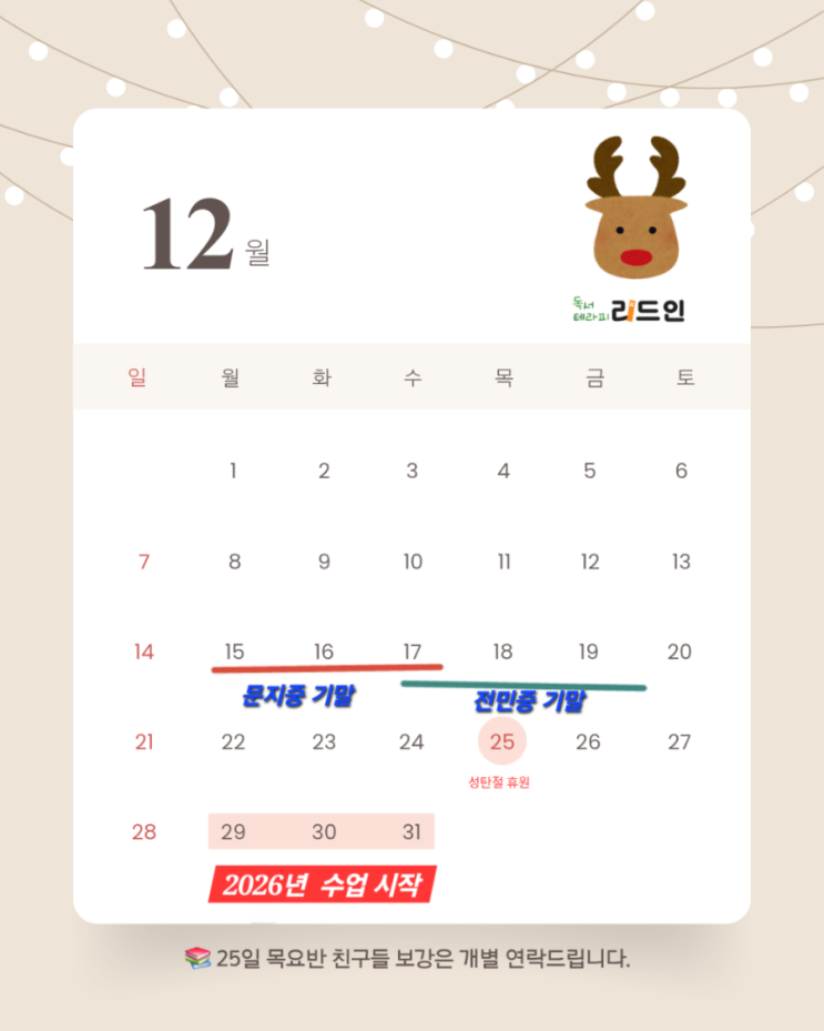12월15~19일까지 문지중,전민중 기말 시험 기간입니다. 25일 성탄일 휴강은 보강일을 개별적으로 안내 드릴 예정입니다. 12월 29일~31일은 2026년 수업일로 포함됩니다. (2월16~18일 구정 연휴 대체) 2025년 달력의 마지막 장이 남아 있습니다. "유종의 미" 저는 이 말이 참 좋습니다. 혹자는 "과정이 어떻든 끝이 좋으면 된다"라고 말하지만 제 생각은 조금 다릅니다. 끝이 좋으려면 순간의 과정들이 진실해야 하고, 내가 원하는 방향을 향하고 있어야 합니다. 하루하루를 성실히 쌓아가며 비로소 '유종의 미'라는 아름다운 결론에 도달한다고 생각합니다. 12월의 소중한 날들 리드인 친구들과 아름다운 유종의 미....... <img src="https://blogthumb.pstatic.net/MjAyNTEyMTJfMiAg/MDAxNzY1NDg3NDkxODM5.4AmEhr_htG2DdOJLDFYWye43zWJU9M6W7VFMw_PKM0kg.ijywVCv86zAO7bL5TGf2AHCWSH-bUQN982NAPMDEj5gg.PNG/900%A3%DFBandPhoto%A3%DF2025%A3%DF11%A3%DF26%A3%DF04%A3%DF44%A3%DF12.png?type=s3" />